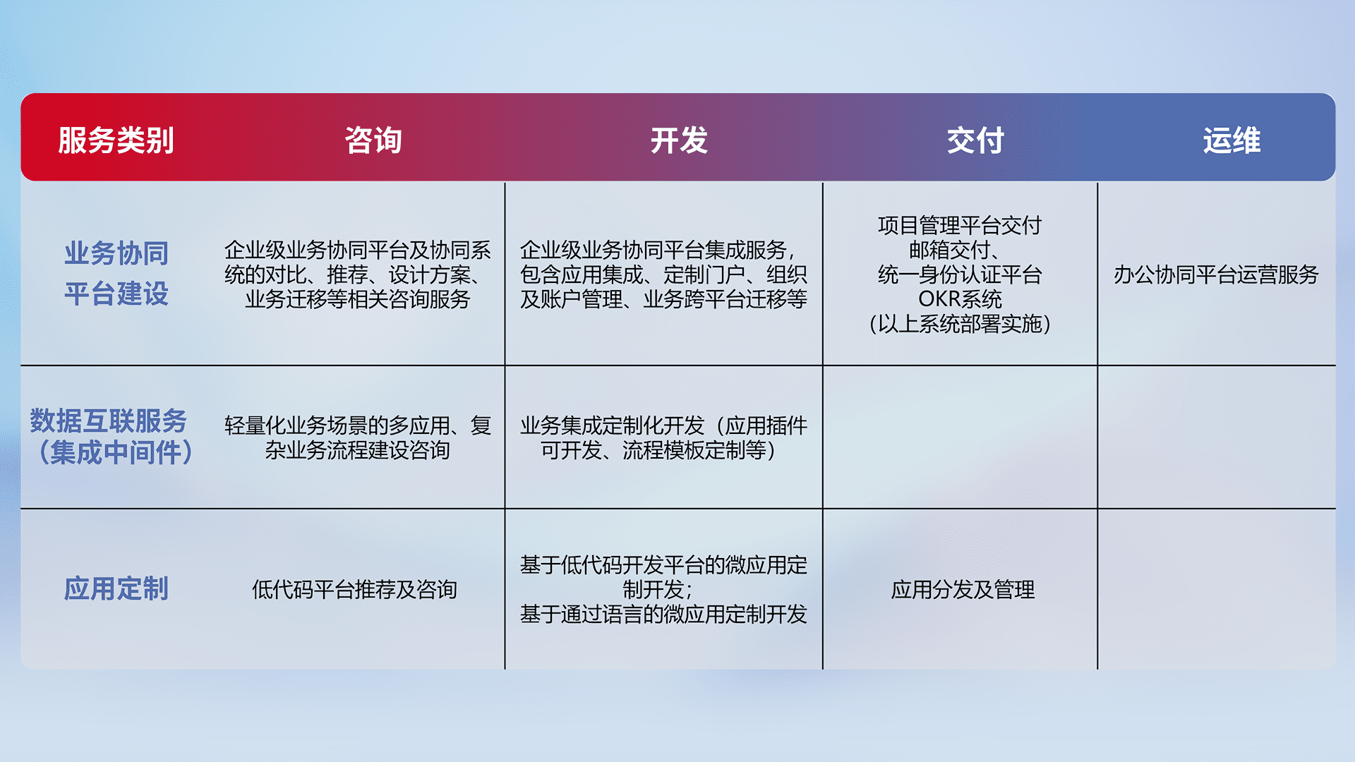 基于全代码低代码的数字化应用系统开发及交付,,满足特定业务场景的应用开发及集成,,,,提升企业业务信息化及数字化能力。。
